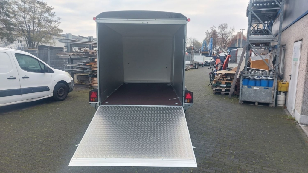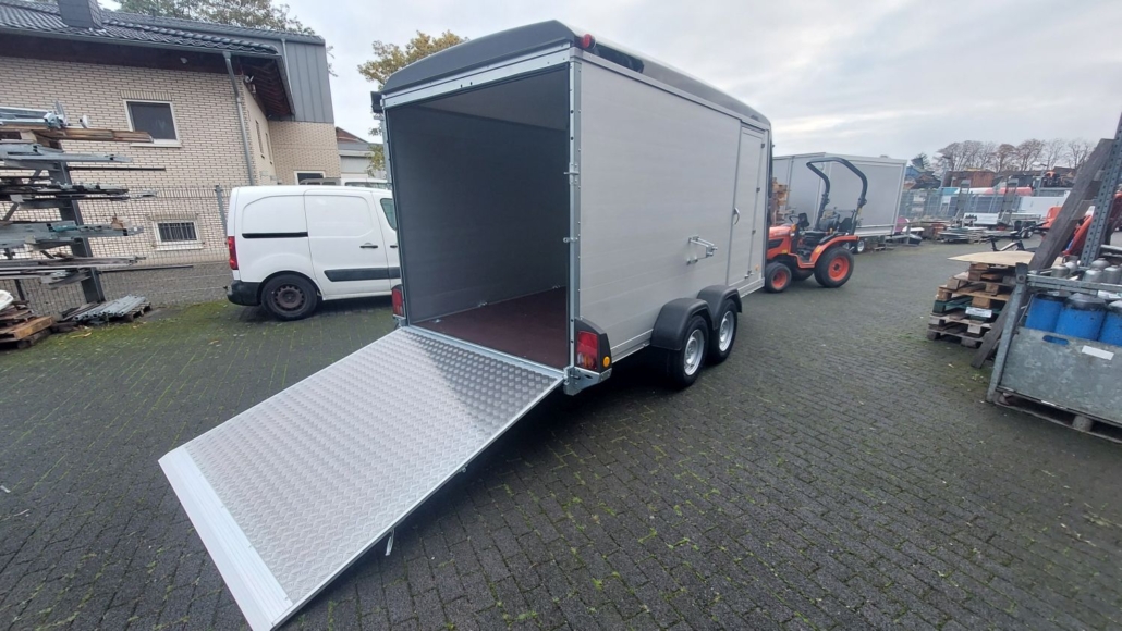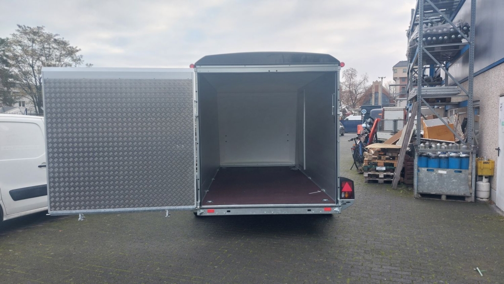 Der Boden besteht aus einer rutschfesten Siebdruckplatte, die besonders robust und pflegeleicht ist. Die Bordwände sind aus 18 mm starken Aluminiumprofilen gefertigt und tragen zusätzlich zur Stabilität bei. Besonders praktisch ist die Kombination aus 1-Flügeltür und Auffahrrampe mit Silikonbeschichtung – ideal für das Be- und Entladen von Geräten, Maschinen oder rollbaren Gütern.