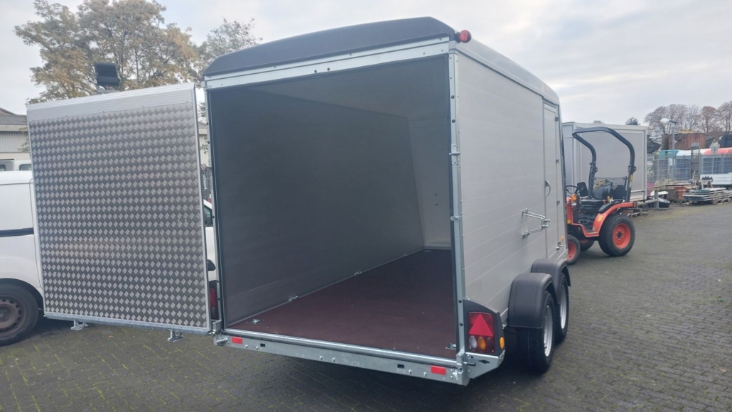 Der Aufbau besteht aus einer Vollaluminium-Konstruktion in Kombination mit einem Polyester-Bug und -Dach, was dem Anhänger nicht nur ein modernes und elegantes Design, sondern auch eine hohe Stabilität und Langlebigkeit verleiht. Zudem sind verschiedene Farbvarianten erhältlich, um den Anhänger individuell an den Einsatzbereich oder das Firmenerscheinungsbild anzupassen.