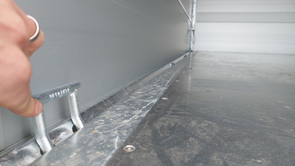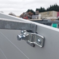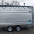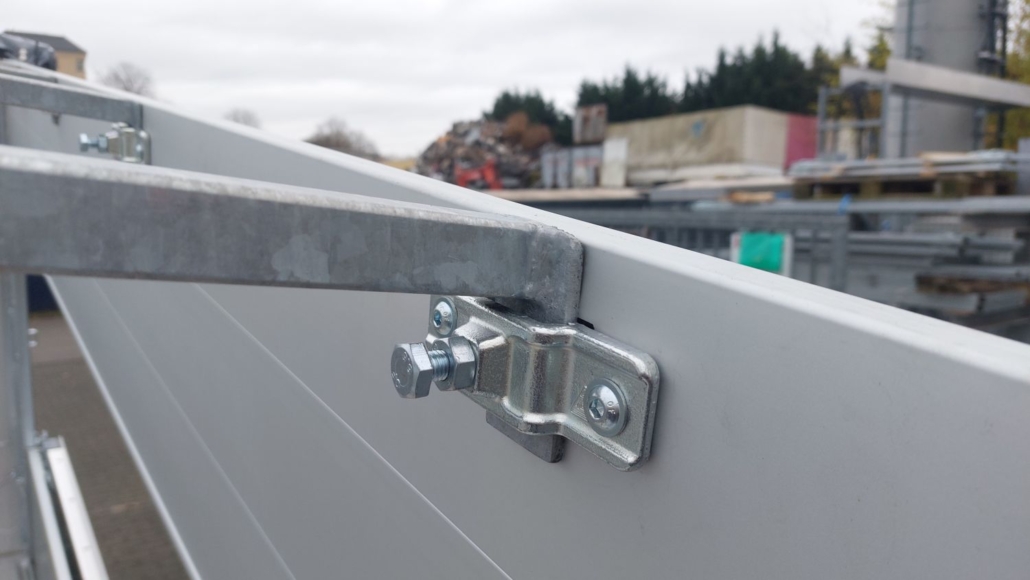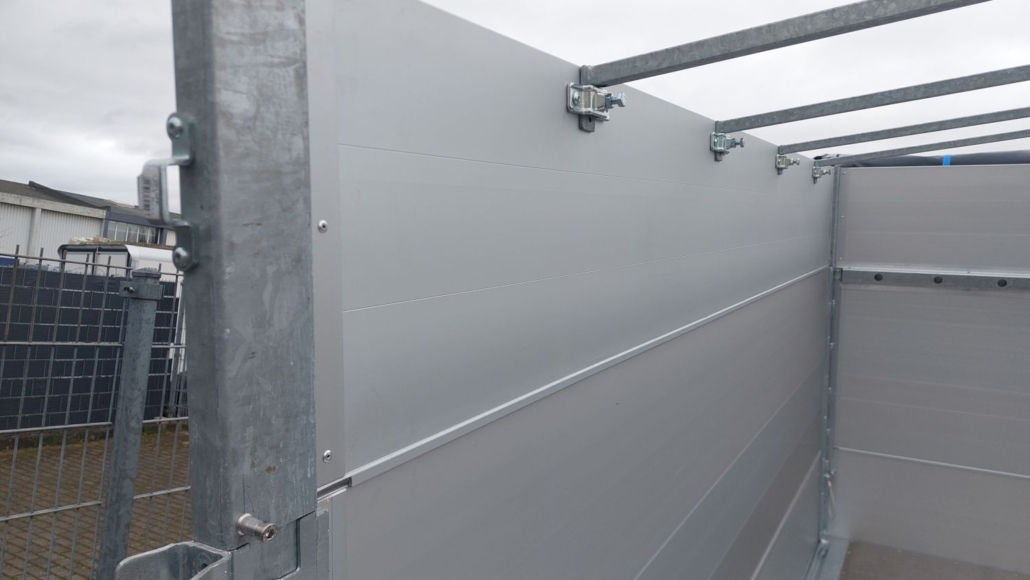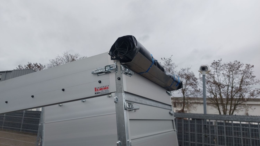 oberen Bordwand ist die Flachplane befestigt. Vier verzinkte Planen-Bügel verhindern Wasser-