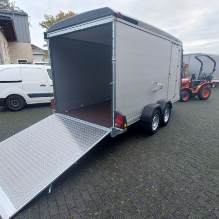 Stabiler Kofferanhänger von Unsinn mit selbstragender Alurahmenkonstruktion. Doppelflügelige Hecktüre mit großem Durchgangsmaß. Edelstahldrehstangenverschluss und Aluscharniere. Für gute Beleuchtung ist das transparente Lichtdach und eine 12 Volt-Innenbeleuchtung verantwortlich. Für die Ladungssicherung sorgt ein Zurrschienensystem mit sechs verstellbaren Zurrankern und Stäbchenzurrleisten an den Seitenwänden.